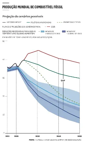 Para aquecer até 1,5°C Em 2023, a lacuna de produção de combustíveis fósseis era de 110% acima do necessário