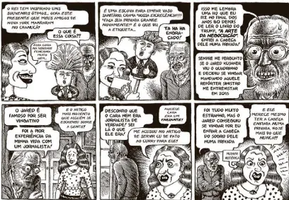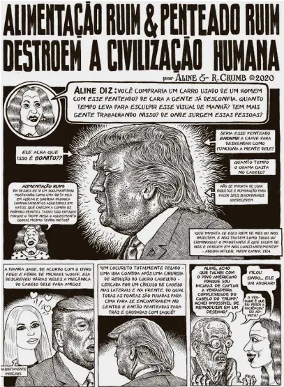Donald e Melania Trump são ridicularizados em Alimentação Ruim & Penteado Ruim, no qual Crumb confessa achar impossível reproduzir o cabelo do presidente americano. Um pouco de modéstia, afinal, seus contornos estão precisos, sem exageros, evitando resultar em uma caricatura de alguém já caricato.